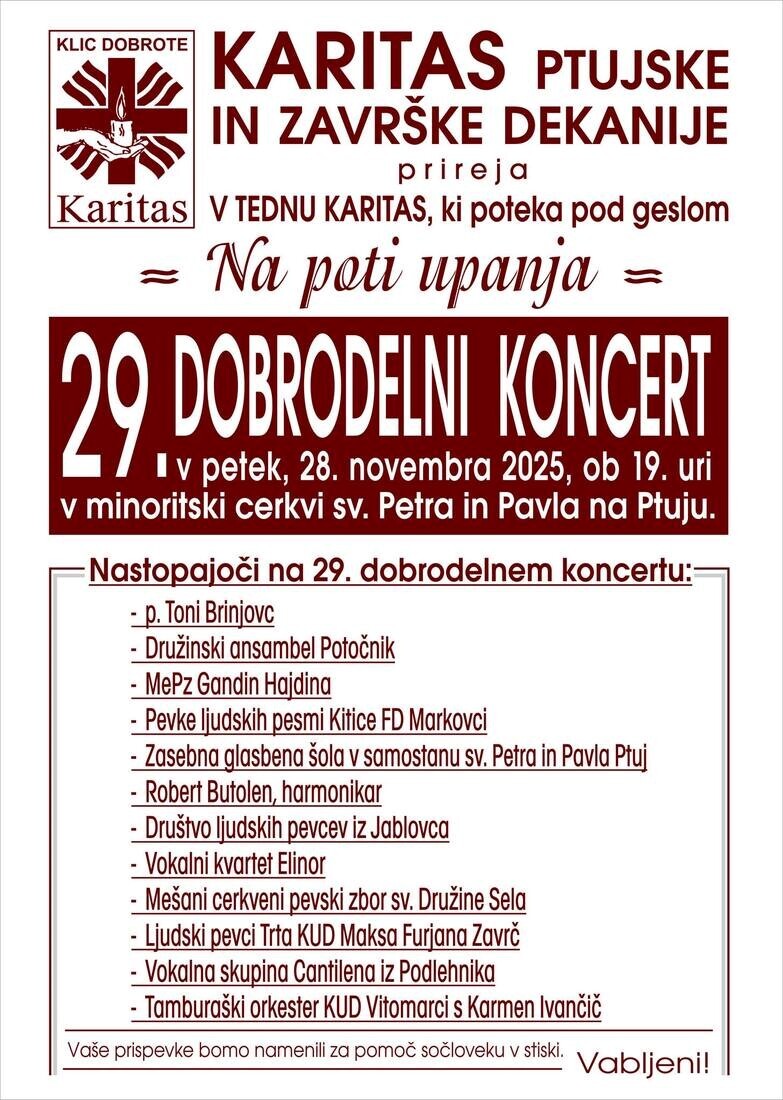 Že devetindvajsetič zapored Karitas ptujske in završke dekanije pripravlja dobrodelni koncert, ki bo združil glasbo in pomoč tistim, ki jo najbolj potrebujejo. Koncert bo v petek, 28. novembra 2025, ob 19. uri v minoritski cerkvi sv. Petra in Pavla na Ptuju.