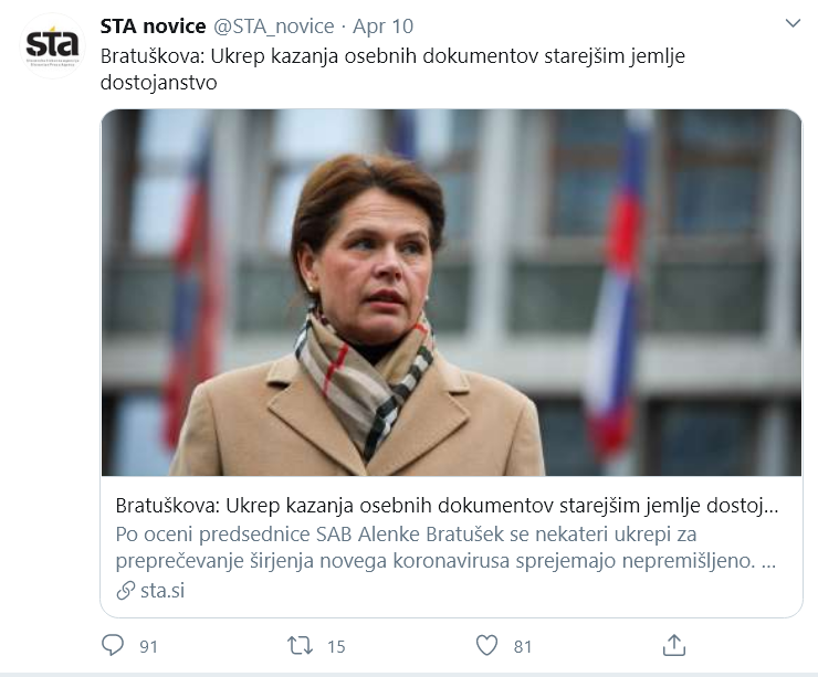 Po oceni predsednice SAB Alenke Bratušek se nekateri ukrepi za preprečevanje širjenja novega koronavirusa sprejemajo nepremišljeno. Izpostavila je sprejet ukrep, da morajo starejši ob vstopu v trgovino pokazati osebni dokument. Meni, da jim s tem ukrepom ni treba še dodatno jemati dostojanstva.