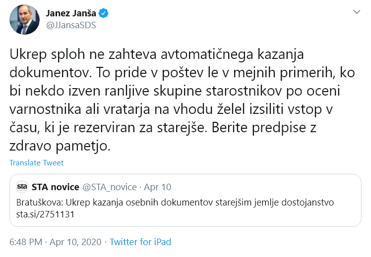 Bratuškova se je ujela na nepoznavanju ukrepov, ko je izjavila, da bodo upokojenci oziroma starejši morali dokazovati svojo starost z osebno izkaznico. To pride v poštev le v mejnih primerih.