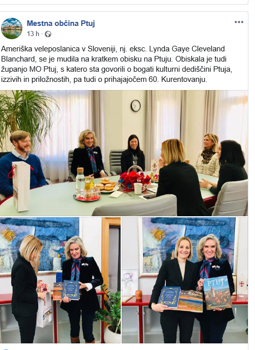 S ptujsko županjo sta govorili o bogati kulturni dediščini Ptuja, izzivih in priložnostih, pa tudi o prihajajočem 60. Kurentovanju. Na Ptujskem gradu je ameriško veleposlanico sprejel tudi direktor Pokrajinskega muzeja Ptuj-Ormož Aleksander Lorenčič.