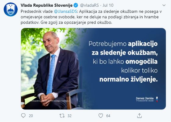 Ob tem je slovenski predsednik vlade dejal, da bo naša aplikacija namenjena sledenju okužbam in ne posega v omejevanje neke osebne svobode, saj ne deluje na principu zbiranja in hrambe podatkov.