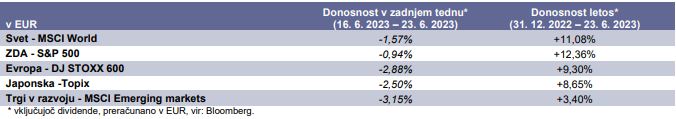 Pretekli teden je prinesel razočaranje na delniške trge, ki so obrnili trend večtedenske rasti tečajev. Na razpoloženje vlagateljev so večji del tedna vplivali namigi o ohlajanju gospodarske rasti in napovedi centralnih bank glede nadaljnjega dvigovanja obrestnih mer. Anketa nabavnih menedžerjev, ki jo je opravilo podjetje S&P Global, je pokazala, da upočasnitev rasti gospodarstev v evroobmočju, na Japonskem in v Avstraliji presega že tako slaba pričakovanja analitikov. Tudi rast v do sedaj močnem storitvenem sektorju je bila počasnejša kot v prejšnjih mesecih, medtem ko proizvodna dejavnost ostaja šibka. Strahove vlagateljev so okrepile tudi norveška, švicarska in predvsem angleška centralna banka, ki so v preteklem tednu dvignile svoje referenčne obrestne mere in napovedale dodatne dvige v prihodnosti. V zagovoru pred ameriškim kongresom je predsednik ameriške centralne banke (Fed) Jerome Powell napovedal, da do konca leta pričakuje še en ali dva dviga obrestne mere. Po premoru, ko Fed na prejšnjem zasedanju ni dvignil obrestne mere, tudi tržni udeleženci pričakujejo še dva dviga za 25 bazičnih točk do konca leta.