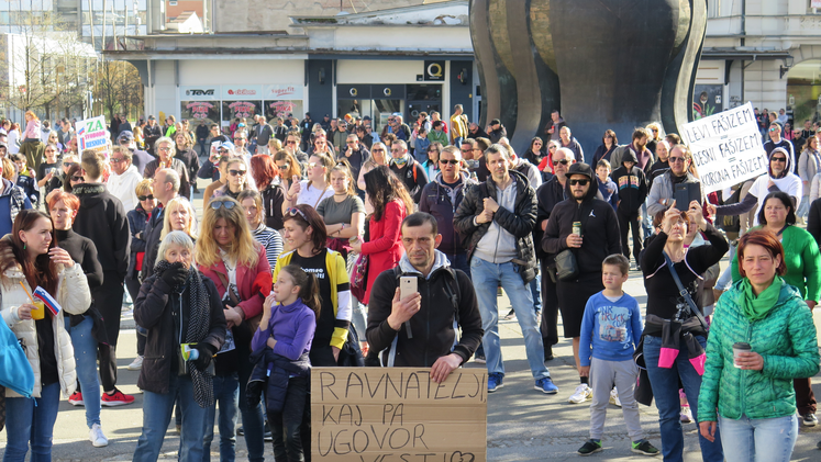Na Trgu svobode v Mariboru se je danes popoldne zbralo 400 ljudi in izražalo nestrinjanje z ukrepi. Na policiste so nespoštljivo žvižgali.