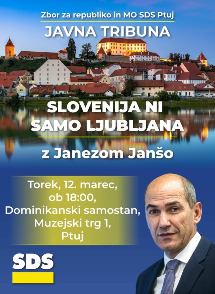 Zbor za republiko in Mestni odbor Slovenske demokratske stranke (SDS) Ptuj vas vljudno vabijo na javno tribuno z naslovom “Slovenija ni samo Ljubljana”, kjer bo kot gost predavatelj nastopil predsednik Slovenske demokratske stranke, Janez Janša. Dogodek se bo odvil v torek, 12. marca 2024, ob 18:00 uri v prostorih Dominikanskega samostana na Muzejskem trgu 1 na Ptuju.