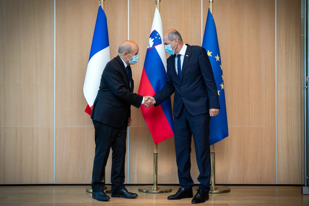 Predsednik slovenske vlade Janez Janša se je v petek na Brdu pri Kranju ob robu posveta slovenske diplomacije srečal z ministrom za Evropo in zunanje zadeve Francoske republike Jean-Yves Le Drianom.