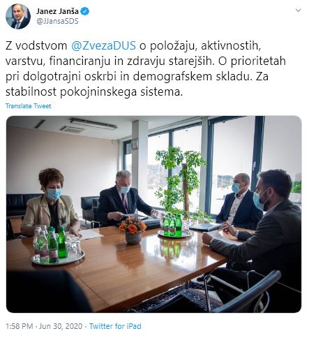 Predsednik vlade Janez Janša je pred dnevi sprejel vodstvo Zveze društev upokojencev Slovenije (ZDUS), in sicer predsednika Janeza Sušnika in podpredsednico zveze Vero Pečnik in z njima spregovoril o položaju, aktivnostih, varstvu, financiranju in zdravju starejših.