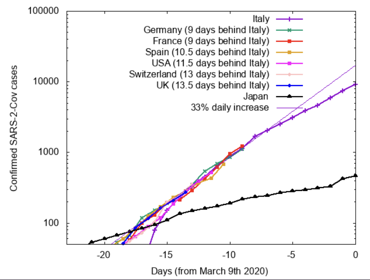Grafika prikazuje, da je sistem v ostalih državah glede stopnjevanja primerov okuženih dokaj podoben: sprva zgolj nekaj okuženih, ljudje situacije in opozoril ne jemljejo resno… nakar število okuženih hitro esklaira in postane neobvladljivo. Številne države imajo stopnjo dnevnega naraščanja okuženih z Covid-19 podobno kot Italija, in sicer 33 %. Glede na omenjeno in število dni zaostanka za Italijo (glede na prvo okužbo) lahko v prihodnjih dneh in tednih pričakujemo izredno stanje in karanteno tudi v drugih evropskih državah. Glede na primerjave bi lahko karanteno v Sloveniji pričakovali že sredi naslednjega tedna.