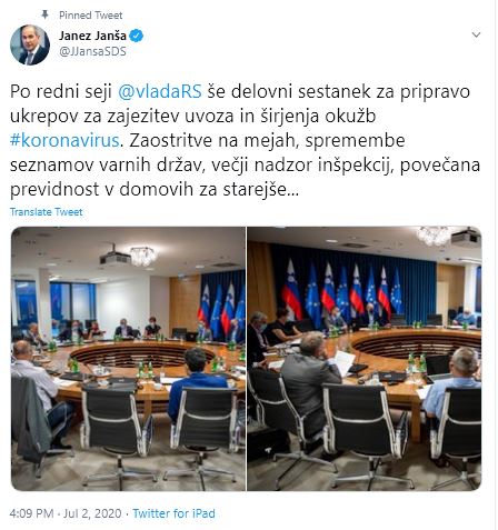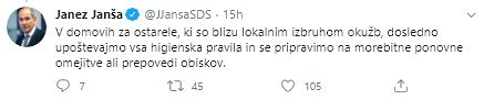 “V domovih za ostarele, ki so blizu lokalnim izbruhom okužb, dosledno upoštevajmo vsa higienska pravila in se pripravimo na morebitne ponovne omejitve ali prepovedi obiskov,” je na twitter računu še navedel premier Janez Janša.