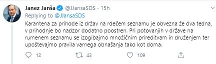 Kot je pojasnil predsednik vlade na svojem twitter profilu je karantena za prihode iz držav na rdečem seznamu obvezna že dva tedna, v prihodnje pa bo nadzor na mejah dodatno poostren. V zvezi s potovanji v države na rumenem seznamu predsednik vlade Janez Janša poudarja, da se je potrebno izogibati množičnim prireditvam in druženjem ter upoštevajmo pravila varnega obnašanja tako kot doma.
