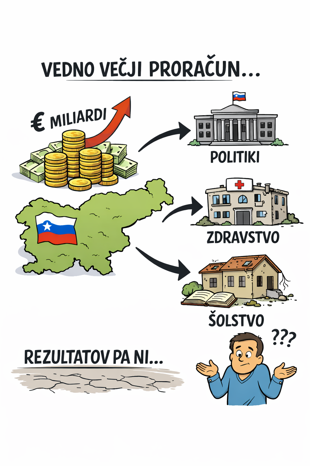 Sklep je jasen: večja poraba ni nujno problem, če je učinkovita. Problem nastane, ko se proračuni debelijo, ljudje pa imajo občutek, da so javne storitve (dostopnost, čakalne dobe, upravna učinkovitost) vse bolj nepredvidljive. V takšnih razmerah bi morala država javnosti pokazati ne samo zneske, ampak tudi rezultate, ki jih je s tem denarjem kupila.