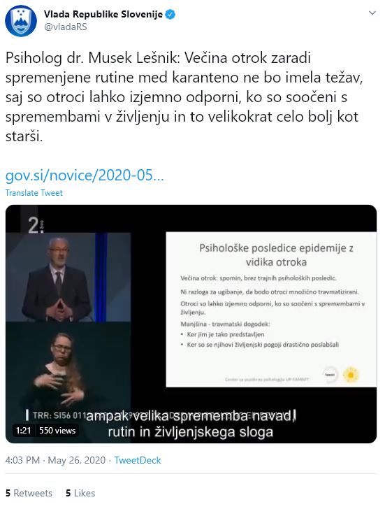 Dodal je, da bi morali opozarjati tudi na nekatere pozitivne posledice tega obdobja za naše otroke: razvijali so zmožnost prilagajanja, se spoprijemali s frustracijami in obvladovanjem okolja, razvijali kompetentnost, ustvarjalnost in vztrajnost pri spoprijemanju z manj ugodnimi okoliščinami.