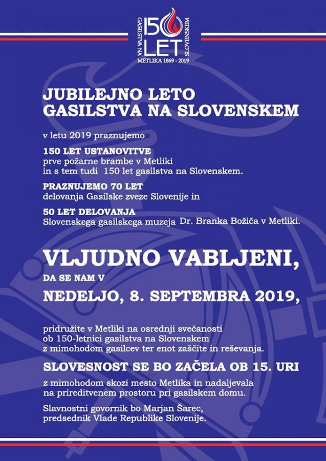 Slovensko gasilstvo letos praznuje kar tri visoke jubileje. Konec avgusta so v Metliki že praznovali 50 let Slovenskega gasilskega muzeja dr. Branka Božiča, ta konec tedna pa bodo slovenski gasilci in gasilke v Metliki praznovali 70- letnico Gasilske zveze Slovenije ter 150- letnico organiziranega gasilstva na Slovenskem in obenem najstarejšega prostovoljnega gasilskega društva.