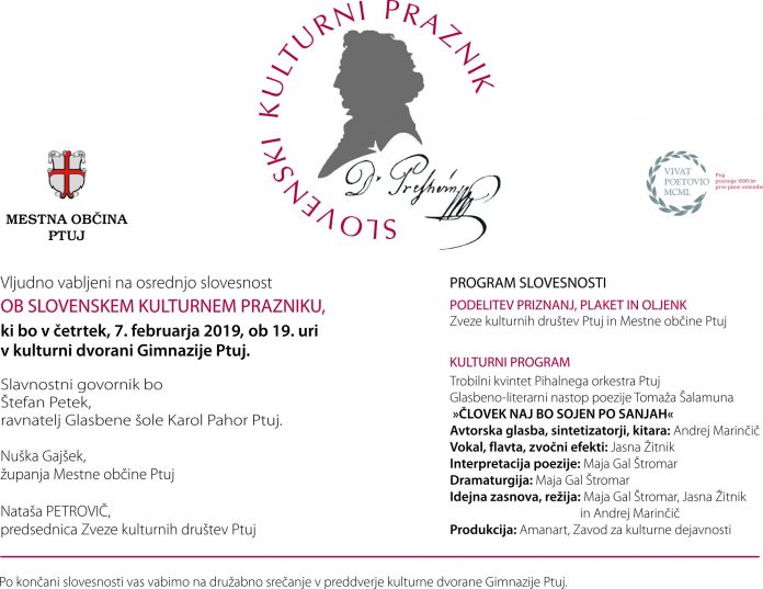 Objavljamo pregled dogodkov, ki se bodo zvrstili ob kulturnem prazniku na Ptuju 7. in 8. februarja 2019.