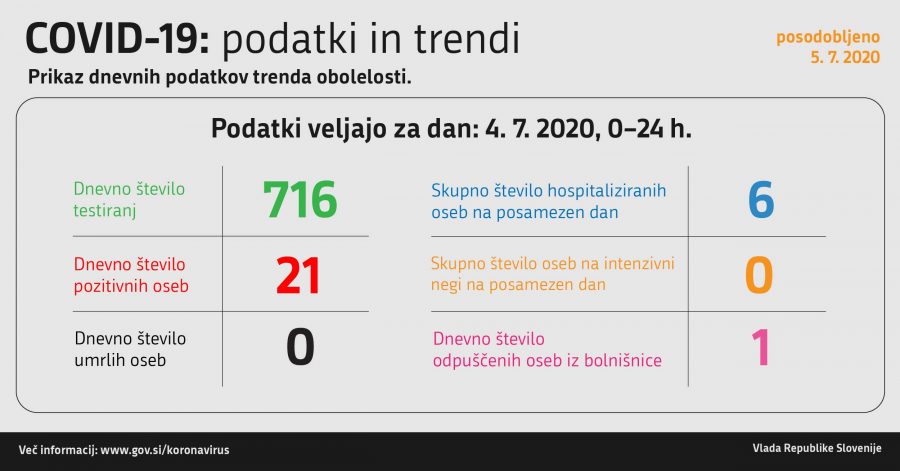 Trend obolelosti s koronavirusom v Sloveniji na dan 4.7.2020 (00:00-24:00):