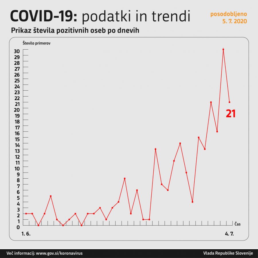 Včeraj na dan 4.7.2020 (00:00-24:00) so opravili 716 testiranj. Polovico manj kot dan poprej, ampak število pozitivnih je vseeno ostalo na visoki ravni. Včeraj je bilo 21 oseb pozitivnih na COVID-19.
