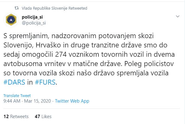 Po včerajšnjem uspešno izpeljanem prvem konvoju tovornih vozil iz  Italije v Hrvaško, se je sprostila situacija podravski avtocesti. Poleg policistov so tovorna vozila skozi našo državo spremljala vozila DARS in FURS. S spremljanim, nadzorovanim potovanjem skozi Slovenijo, Hrvaško in druge tranzitne države so do sedaj omogočili 274 voznikom tovornih vozil in dvema avtobusoma vrnitev v matične države.