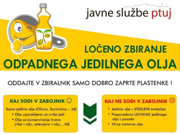 V družbi Javne službe Ptuj si prizadevajo za osveščanje občanov o pravilnem in doslednem ločevanju odpadkov ter o skrbi za čisto in zdravo okolje. Pozitivni rezultati se že kažejo, je pa pred njimi še en izziv – izločanje odpadnih jedilnih olj iz okolja. Odpadna jedilna olja in maščobe namreč gospodinjstva večinoma odlagajo v odtok ter s tem povzročajo ogromno okoljsko in gmotno škodo, so prepričani v ptujskih Javnih službah.