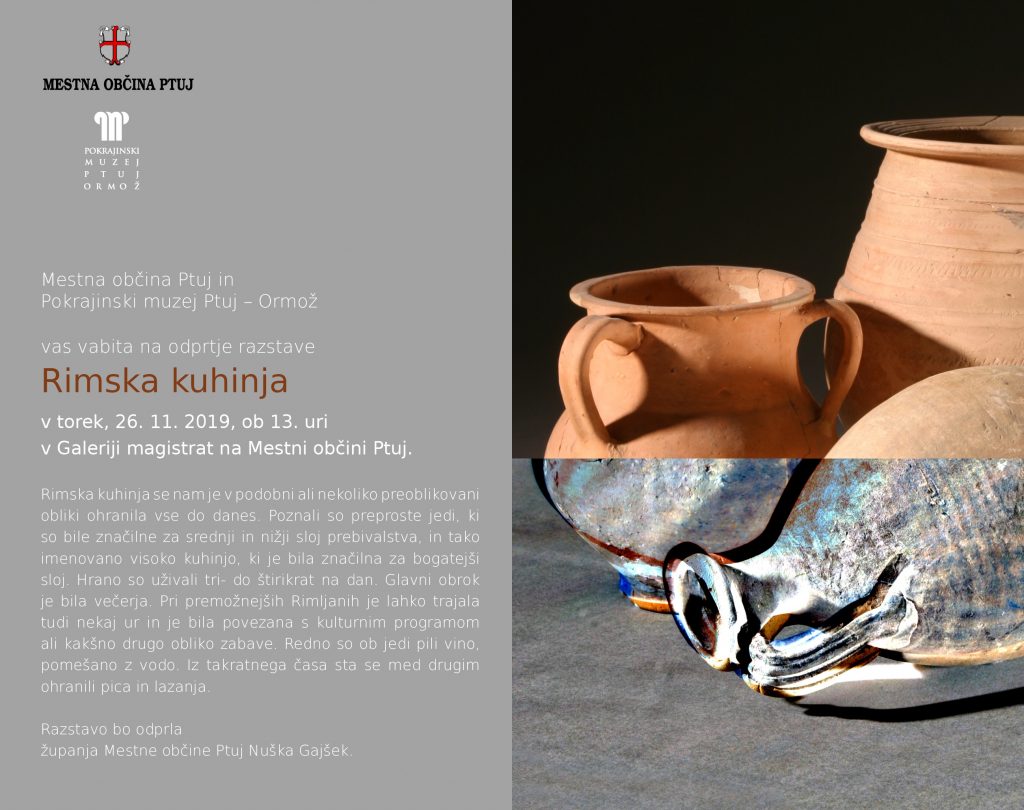 Arheološko razstavo »Rimska kuhinja« bo županja Mestne občine Ptuj Nuška Gajšek odprla v torek, 26. novembra, ob 13. uri v mestni hiši na Ptuju, v tamkajšnji galeriji. Avtor razstave, skozi katero bo mogoče veliko izvedeti o kulinaričnih navadah starih Rimljanov, je Ivan Žižek iz Pokrajinskega muzeja Ptuj – Ormož (PMPO).