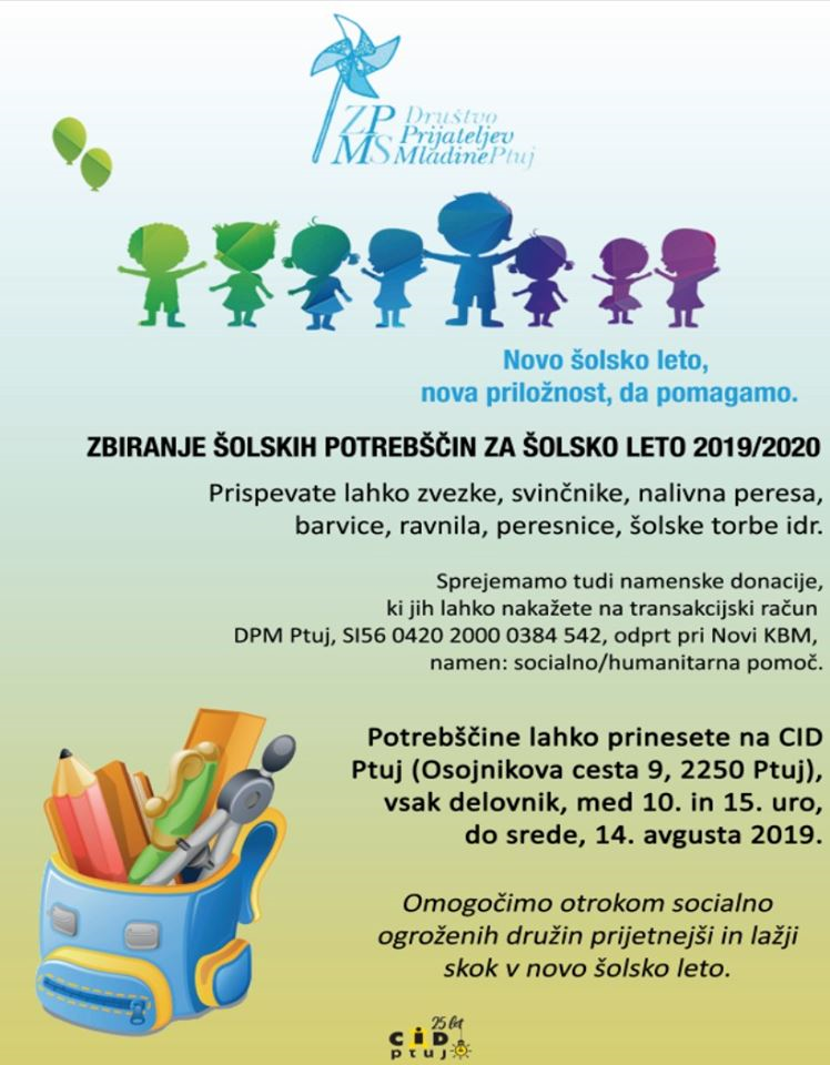 Prispevate lahko zvezke, svinčnike, nalivna peresa, barvice, ravnila, peresnice, šolske torbe idr., sprejemajo pa tudi namenske donacije, ki jih lahko nakažete na transakcijski račun DPM Ptuj, SI56 0420 2000 0384 542, odprt pri Novi KBM, namen: socialno/humanitarna pomoč.