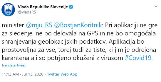 “Pri aplikaciji ne gre za sledenje, ne bo delovala na GPS in ne bo omogočala shranjevanja geolokacijskih podatkov. Aplikacija bo prostovoljna za vse, torej tudi za tiste, ki jim je odrejena karantena ali so potrjeno okuženi z virusom,” je dejal minister Cigler.