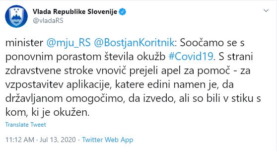 Minister na javno upravo Boštjan Koritnik je danes sporočil, da minister se soočamo se s ponovnim porastom števila okužb. S strani zdravstvene stroke so vnovič prejeli apel za pomoč – za vzpostavitev aplikacije, katere edini namen je, da državljanom omogočimo, da izvedo, ali so bili v stiku s kom, ki je okužen.