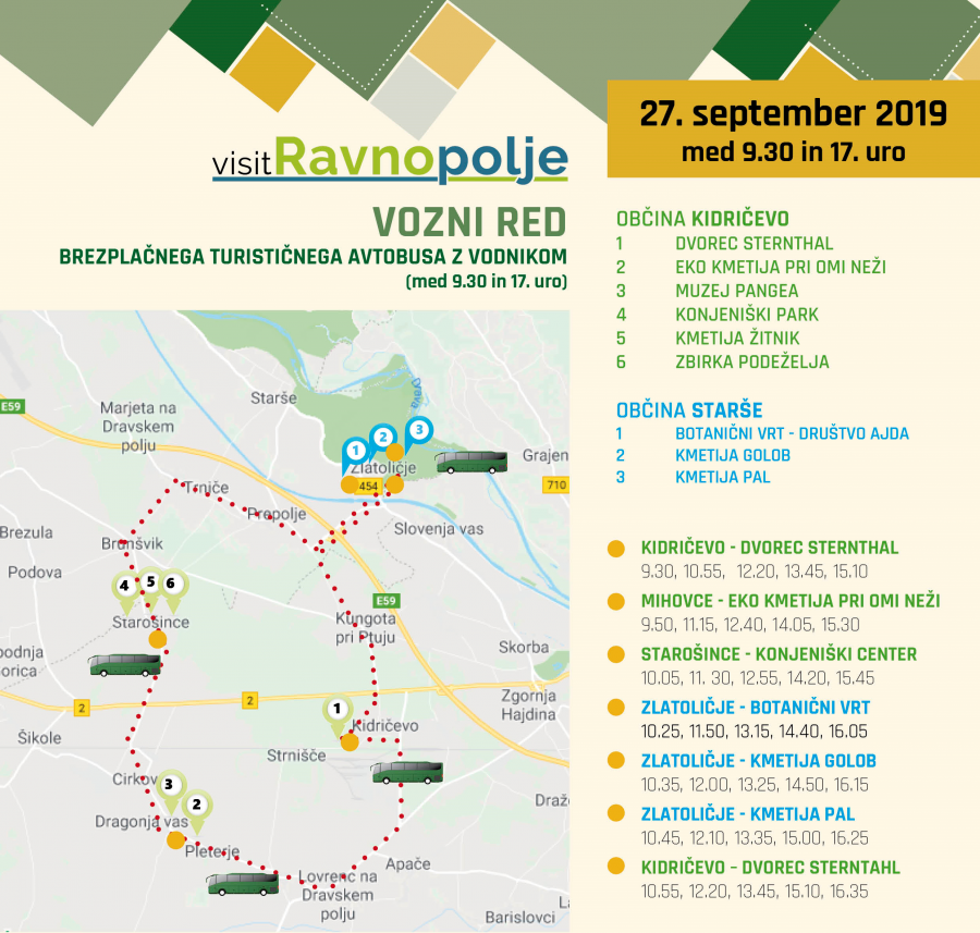 »V Kidričevem, Mihovcih, Starošincah in Zlatoličju bodo obiskovalci lahko spoznali kulinarično, gastronomsko in turistično ponudbo destinacije in se pustili razvajati gostoljubnim lokalnim ponudnikom. Obiskovalcem bo na voljo brezplačni turistični avtobus z vodnikom od 9.30 do 17. ure. Prav tako vas na ta dan čaka poseben dodatni program: delavnice (kulinarične in ustvarjalne), degustacije, panoramska vožnja s kočijo, igra za otroke v muzeju, predavanja in še mnogo več. Vstop na vse lokacije je na ta dan prost,« je povedala Sonja Breznik, predsednica TD Občine Kidričevo in vodja destinacije Visit Ravno polje.