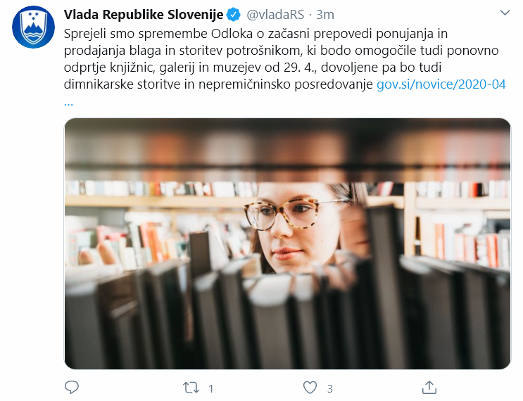 Postopno se sprošča storitve na področju kulturne dejavnosti, kjer je kljub zaprtemu prostoru storitev možno organizirati na način, da je onemogočen stik med potrošniki, kot je v knjižnicah, muzejih in galerijah, kjer mora biti število obiskovalcev in njihovo gibanje strogo nadzorovano.