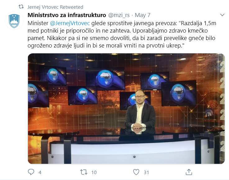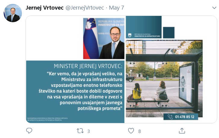 Vlada ugotavlja, da so prenehali razlogi za začasno prepoved in omejitve javnega prevoza potnikov v Republiki Sloveniji, zato se javni potniški promet v skladu s higienskimi priporočili Nacionalnega inštituta za javno zdravje lahko ponovno izvaja. Ponovno izvajanje javnega potniškega prometa bo omogočeno z 11. majem 2020.