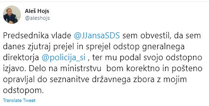 Hojs je sporočil tudi, da je danes prejel odstop generalnega direktorje policije Antona Travnerja.