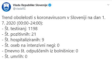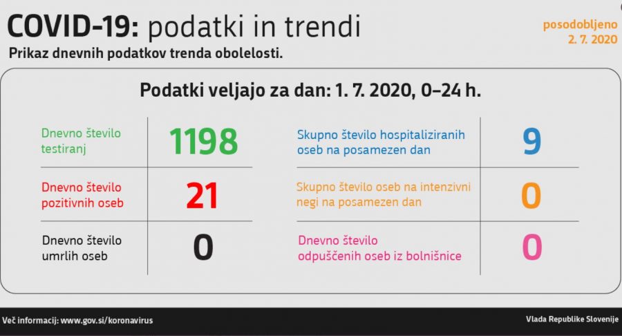 Včeraj je bilo opravljenih 1198 testov za koronavirus. Pozitivnih je bilo 21.