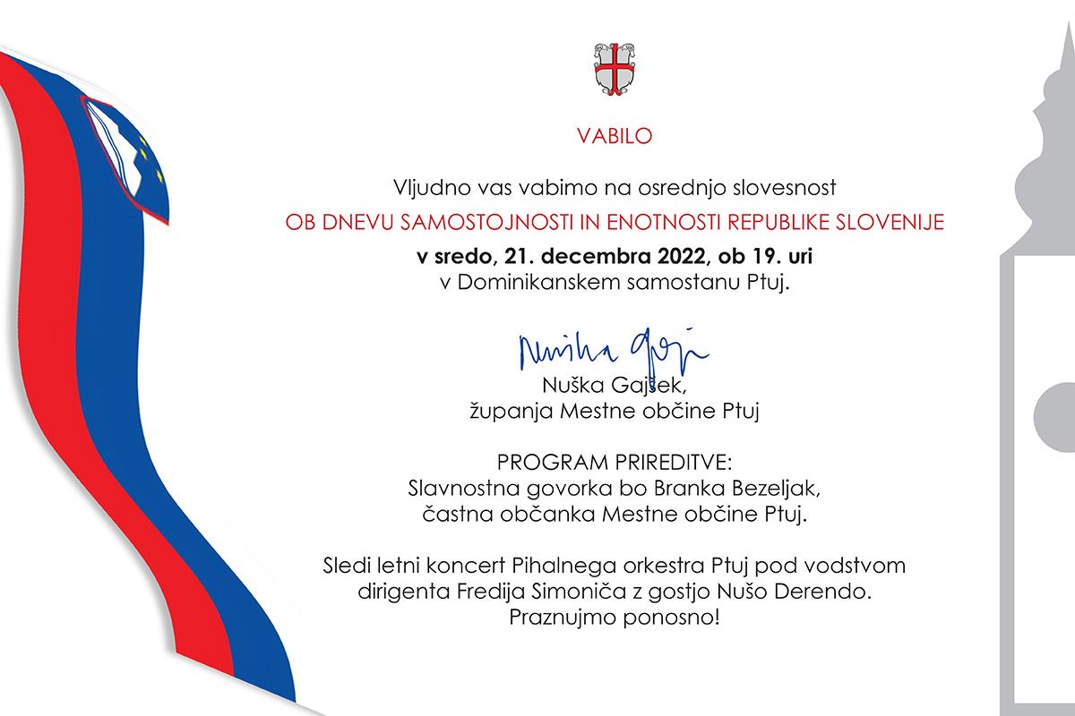 Vljudno vas vabimo na osrednjo slovesnost OB DNEVU SAMOSTOJNOSTI IN ENOTNOSTI REPUBLIKE SLOVENIJE, ki bo v sredo, 21. decembra 2022, ob 19. uri v Dominikanskem samostanu Ptuj.