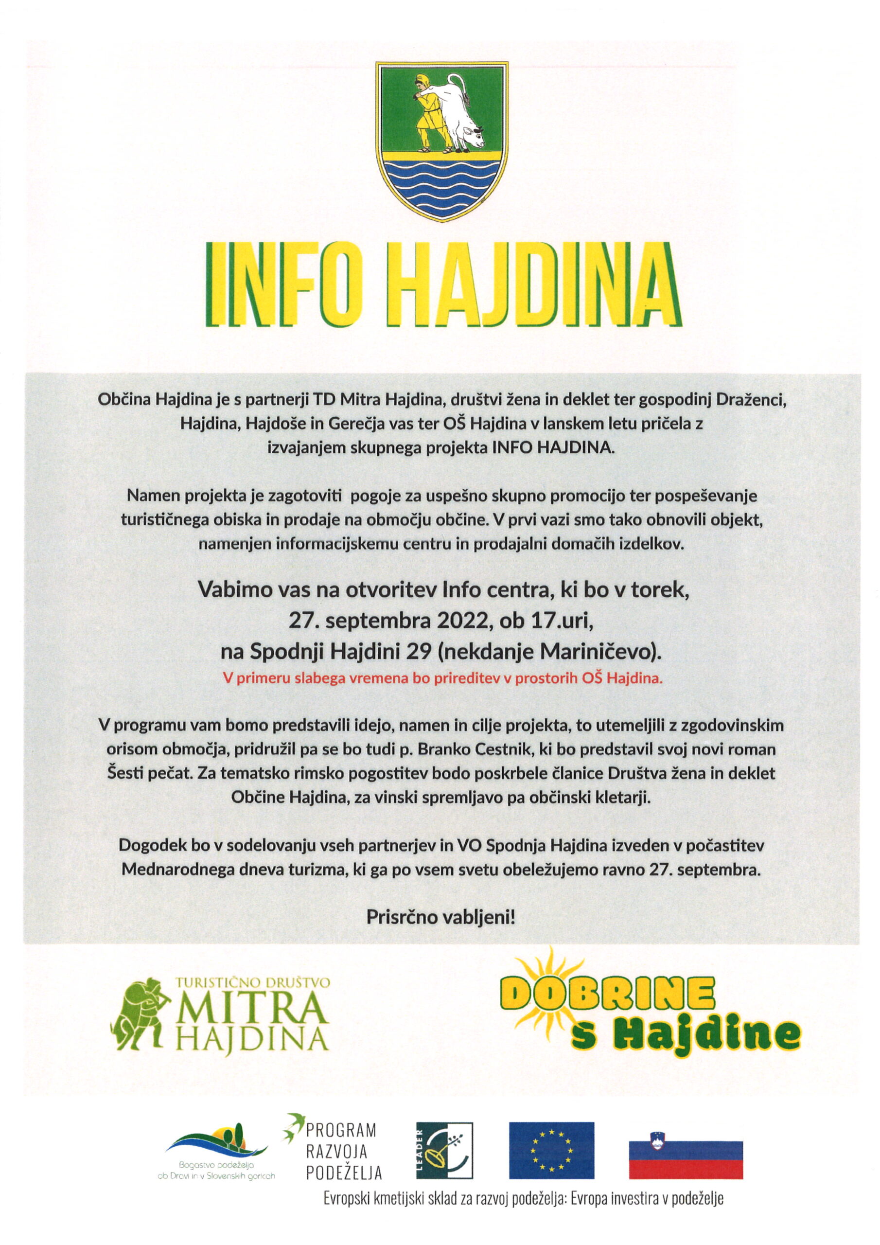 Otvoritev INFO CENTRA na Spodnji Hajdini 29 (nekdanje Mariničevo) 27. septembra, 2022 Delite na Facebooku Deli na Twitterju V torek, 27. septembra 2022, ob 17. uri, bo otvoritev Info centra na Sp. Hajdini (nekdanje Mariničevo). Prireditev bo zaradi napovedanega dežja v telovadnici OŠ Hajdina. Več informacij v spodnjem vabilu.