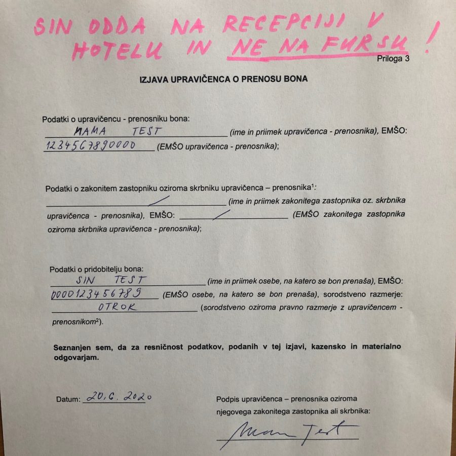 Vse upravičence bonov obveščamo, da morajo imeti vse izjave o prenosu bona (podpisane!) s seboj v nastanitvi, kjer bodo bon unovčili.