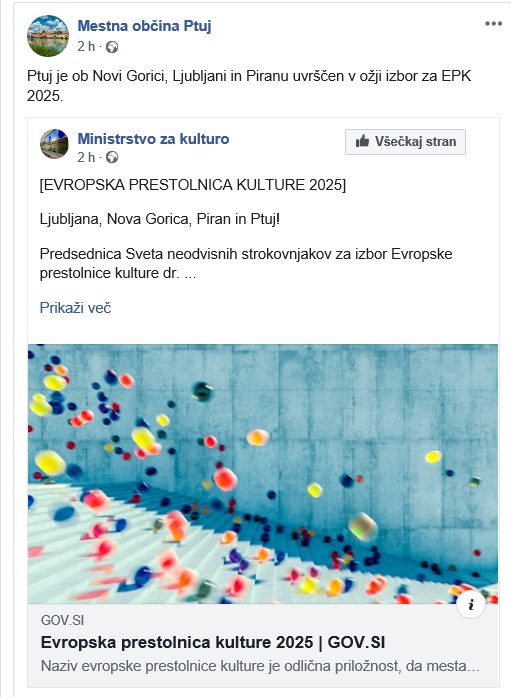 Spomnimo, da je Ministrstvo za kulturo je 22. februarja 2019 objavilo razpis za aktivnosti Unije za oddajo prijav za »Evropsko prestolnico kulture« za leto 2025 v Sloveniji. Naziv evropske prestolnice kulture je odlična priložnost, da mesta spremenijo svojo podobo, se umestijo na svetovni zemljevid, privabijo več turistov in ponovno razmislijo o svojem razvoju s pomočjo kulture.