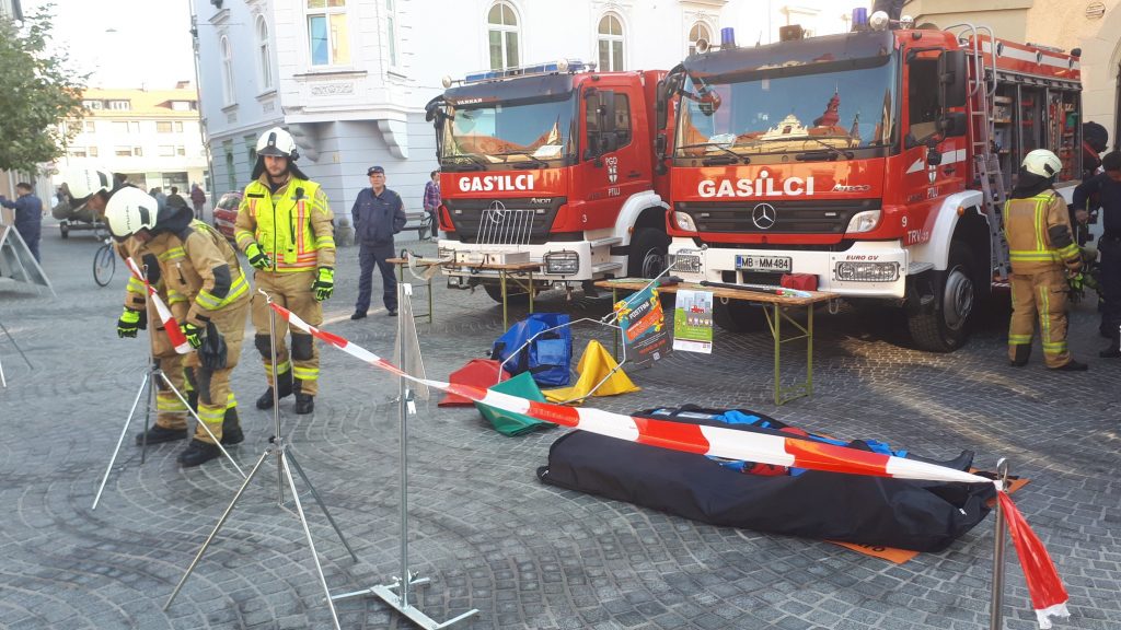 Gasilci so pred ptujsko mestno hišo pripravili zanimivo predstavitev gasilskih vozil in tehnike, posebej za otroke so prikazali vajo z vedrovko, za vse ostale obiskovalce pa prikaz temeljnih postopkov oživljanja z uporabo defibrilatorja (AED).