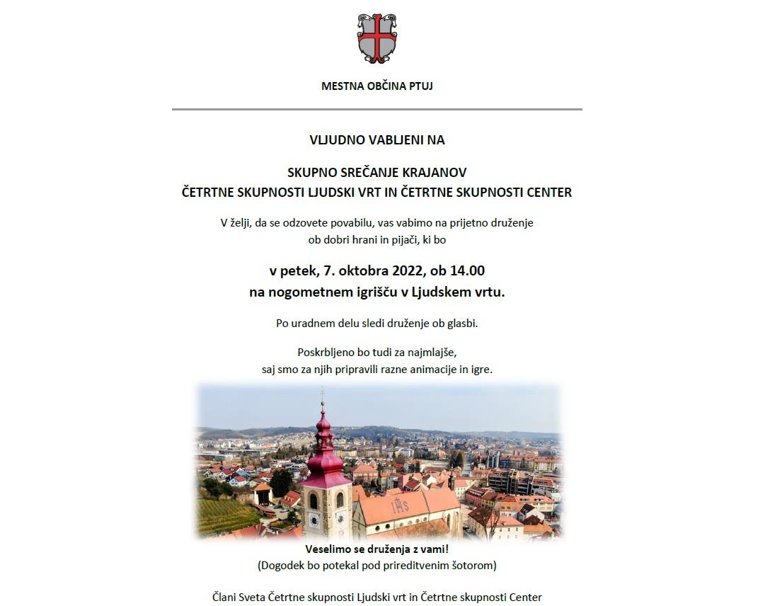 Vljudno vabljeni na skupno srečanje krajanov Četrtne skupnosti Ljudski vrt in Četrtne skupnosti Center.