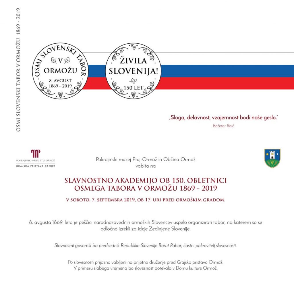 Pokrajinski muzej Ptuj-Ormož in občina Ormož sta organizatorja današnje slavnostne akademije ob 150. obletnici osmega tabora v Ormožu (1869–2019), dogodka, ki poteka v okviru letošnjega praznika KS Ormož.
