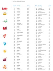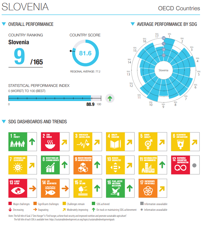 Slovenija je pri doseganju 17 globalnih ciljev trajnostnega razvoja (Sustainable Development Goals – SDG) sicer najbolje ovrednotena pri cilju 1 (odprava ekstremnih oblik revščine), cilju 8 (dostojnem delu in gospodarski rasti) in pri cilju 16 (miru, pravičnosti in močnih institucijah). Ostaja tudi nekaj izzivov za naprej, vsekakor pa veseli dejstvo, da je Slovenija ocenjena bolje kot npr. Švica (16. mesto), Italija (26. mesto) ali Luxembourg (42. mesto).
