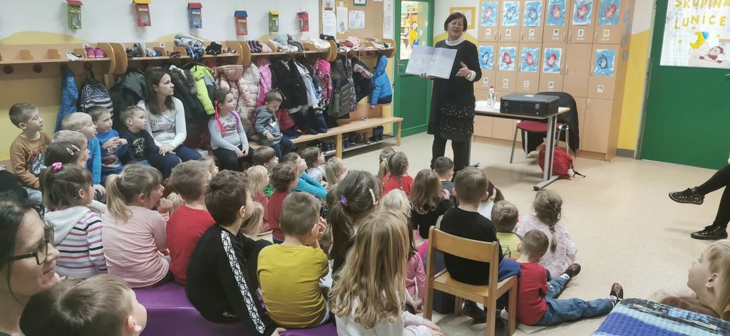 Mlajšim otrokom je s pomočjo knjig predstavila različne zvoke živali ter inštrumentov. Pokazala jim je knjige z različno trdimi platnicami ter oblikami, nato pa so se še malo razgibali in poimenovali različne predmete ter živali, ki so se v knjigi pojavili.