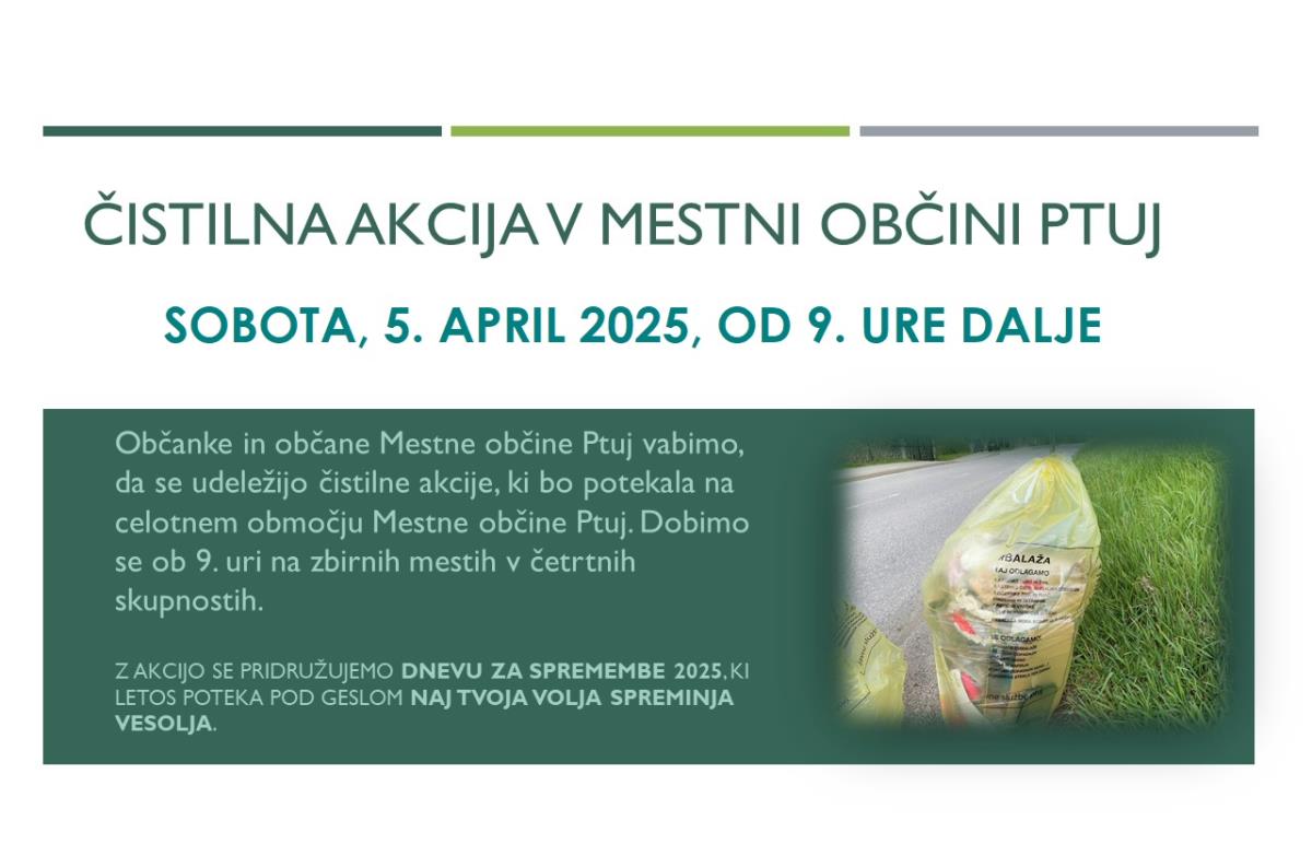 V soboto, 5. aprila 2025, bo Mestna občina Ptuj združila moči z občani v vseslovenski prostovoljski akciji Dan za spremembe, ki letos poteka pod geslom »Naj tvoja volja spreminja vesolja«. Kot poroča Stanka L. (28. 3. 2025), bo čistilna akcija potekala na celotnem območju občine, začela pa se bo ob 9. uri na zbirnih mestih v vseh četrtnih skupnostih.