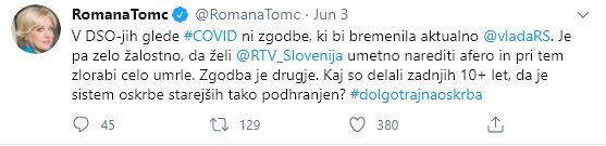 “Vlada Janeza Janše je odgovornost prevzela v času, ko je zdravstvena kriza že napredovala in takoj sprejela vse potrebne ukrepe, da jo čim bolj uspešno zajezi. Slovenijo danes postavljajo ob bok najuspešnejšim državam v boju proti koronakrizi. Žalostno je, da so nacionalni mediji pripravljeni izkoristiti celo umrle, da uspešno vlado neuspešno diskreditirajo,« poudarja evropska poslanka Romana Tomc.