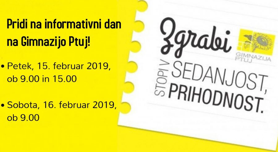 Večina srednjih šol, tudi v Spodnjem Podravju, bo mladim vrata odprla v petek, 14. februarja, ob 9. in 15. uri, v soboto, 15. februarja, pa ob 9. uri. Fakultete in višje šole bodo s predstavitvami v petek ob 10. in 15. uri ter v soboto ob 10. uri nagovarjale srednješolce oziroma bodoče študente.