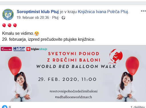Rdeči baloni simbolizirajo ljubezen in sprejemanje vsakršne drugačnosti, zlasti pri otrocih. Pohod na Ptuju organizirajo članice HD Soroptimist Ptuj, pričel pa se bo jutri ob 11. uri izpred Knjižnice Ivana Potrča Ptuj. Udeleženci pohoda se bodo z baloni prehodili po ulicah mestnega jedra.