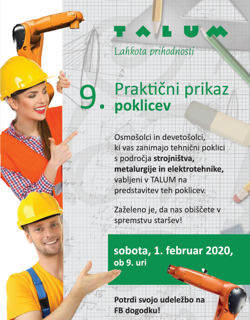 Vse bliže je vpis devetošolcev v srednje šole, vse bliže pa so tudi informativni dnevi. Dva tedna pred informativnimi dnevi, ti bodo letos 14. in 15. februarja na vseh na srednjih šolah, fakultetah in v dijaških domovih, pa so se za praktični prikaz poklicev znova odločili v Talumu v Kidričevem. Šolarjem zaključnih razredov osnovnih šol in njihovim staršem bodo v realnem okolju v kidričevskem Talumu predstavili delo oblikovalca kovin orodjarja, elektrikarja, mehatronika in livarjev.