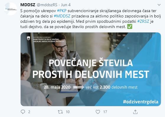 Nekatere gospodarske panoge bodo potrebovale več časa za okrevanje. Kriza je najbolj vplivala na gostinstvo, nadpovprečna rast brezposelnosti je še v dejavnostih prometa in skladiščenja ter poslovanja z nepremičninami. Ravno za tiste delodajalce, ki se soočajo z večjim upadom prometa in znižanjem poslovne aktivnosti, so na vladi pripravili ukrep delnega subvencioniranja skrajšanja polnega delovnega časa, ki je del PKP3. S tem ukrepom želijo omogočiti delodajalcem, da ohranijo delovna mesta in tako zadržijo zaposlene v delovnem razmerju, čeprav začasno za krajši delovni čas. Ukrep zagotavlja ustrezno spodbudo delodajalcem, prav tako pa ohranja nivo socialne varnosti in nadomestilo dohodka delavca. Ukrep je stopil v veljavo s 1.6.2020 in na Zavodu RS za zaposlovanje že beležijo veliko zanimanje delodajalcev za ukrep. Delodajalci bodo ukrep lahko koristili do 31.12.2020.