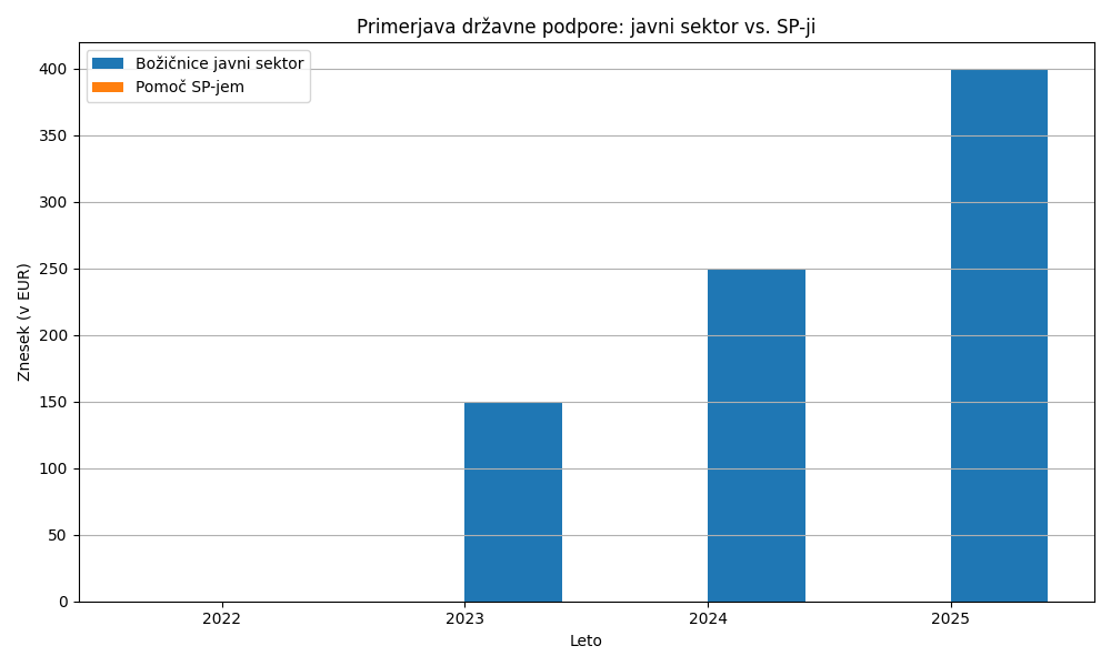 Medtem ko s.p.-ji niso prejeli nobenih olajševalnih ukrepov ali finančnih pomoči v tem obdobju, se je javnemu sektorju godilo bistveno bolje. V letih 2022–2023 je vlada izpogajala obsežne dvige plač in izplačila dodatkov za javne uslužbence, katerih breme nosi državni proračun – ta pa se polni tudi z davki podjetnikov. Oktobra 2022 je bil sklenjen dogovor s sindikati javnega sektorja, vreden približno 611 milijonov evrov. S tem dogovorom je 180.000 zaposlenih v javnem sektorju pridobilo v povprečju 8,5 % višje plače (4,5-odstotni dvig plačnih razredov od 1. oktobra 2022 in dodatni dvig za en plačni razred – okoli 4 % – s 1. aprilom 2023).