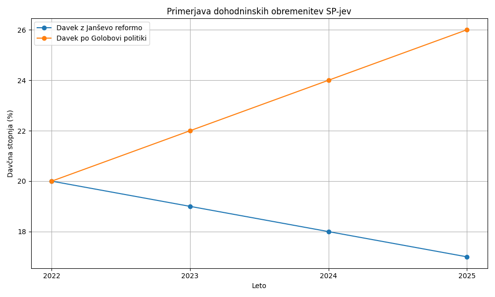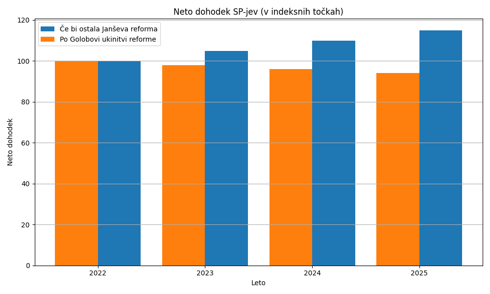 Slovenski samostojni podjetniki (s.p.) so v zadnjih štirih letih občutili znatno poslabšanje svojih neto dohodkov zaradi ukinitve davčne reforme prejšnje vlade. Reforma, ki jo je marca 2022 sprejela vlada Janeza Janše, je nameravala postopno zvišati splošno dohodninsko olajšavo ter znižati davčne stopnje, kar bi povečalo neto zaslužke zaposlenih in podjetnikov. Z novo vlado pa je bila ta ureditev odpravljena konec leta 2022, kar je neposredno znižalo neto plače in dobičke mnogih. Po ocenah bi na primer zavezanec s povprečno plačo zaradi razveljavitve Janševe reforme na letni ravni zaslužil okoli 685 evrov manj neto. Ta udarec v denarnice ne prizanaša niti samostojnim podjetnikom, ki so pogosto v še bolj neenakem položaju.