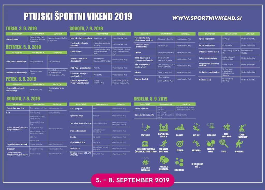 Zavod za šport Ptuj je v sodelovanju z Mestno občino Ptuj, Športno zvezo Mestne občine Ptuj, Fundacijo za šport Republike Slovenije, klubi in društvi pripravil Ptujski športni vikend. Od danes do nedelje, 8. septembra se bo zvrstilo veliko športno-rekreacijskih dogodkov za vse vse generacije.