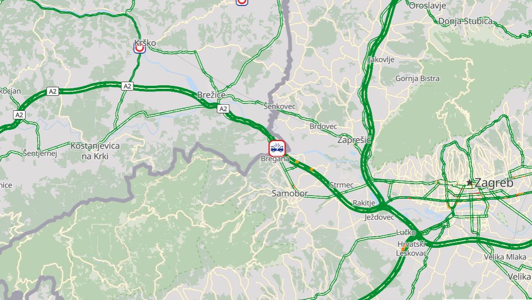 A2, Ljubljana – Obrežje, pred mejnim prehodom Obrežje v smeri Obrežja, prometna nesreča, zaprt vozni pas.