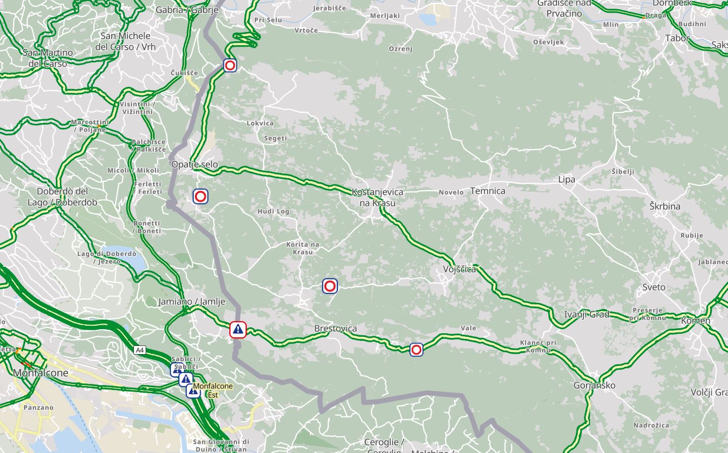 V Italiji je zaprta avtocesta Trst – Benetke, med priključkoma Sistiana, Sesljan in Villesse, v obe smeri. Več. Promet je preusmerjen na vzporedne ceste. Proti Benetkam in obratno je zaenkrat možna pot preko mejnega prehoda Vrtojba, po hitri cesti H4. Iz Maribora in Ljubljane pa preko Avstrije in Vidma (Udine).